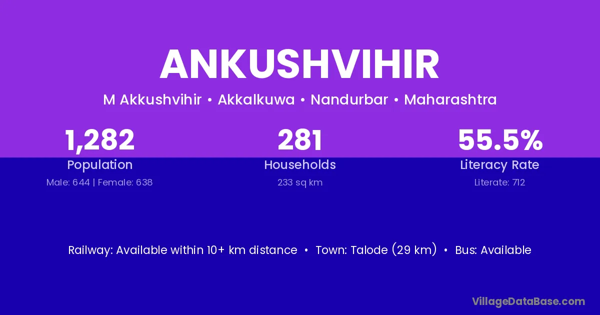 Talode (29 km) is the nearest town to Ankushvihir village for major economic activities and is located approximately 29 km away.