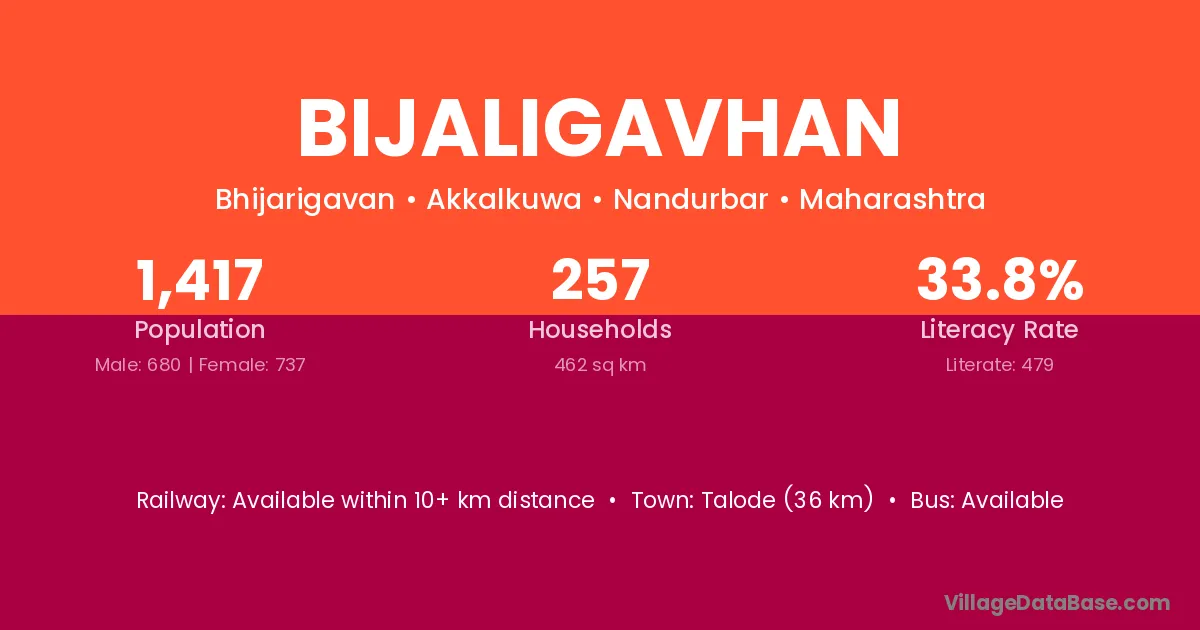 Talode (36 km) is the nearest town to Bijaligavhan village for major economic activities and is located approximately 36 km away.