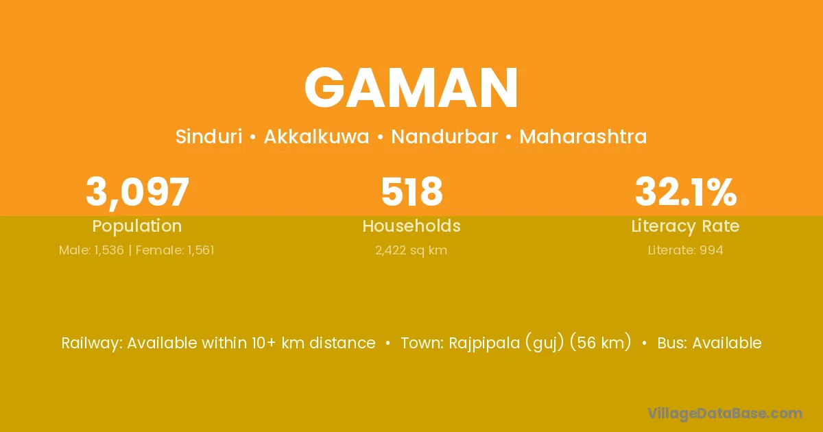 Rajpipala (guj) (56 km) is the nearest town to Gaman village for major economic activities and is located approximately 56 km away.