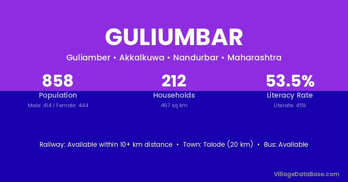 Talode (20 km) is the nearest town to Guliumbar village for major economic activities and is located approximately 20 km away.