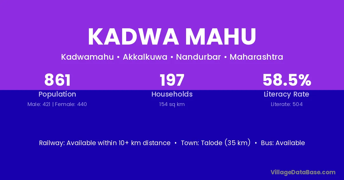 Talode (35 km) is the nearest town to Kadwa Mahu village for major economic activities and is located approximately 35 km away.