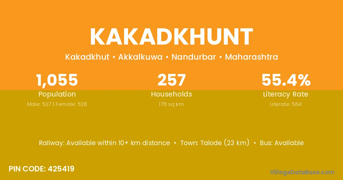 Kakadkhunt village has a total population of 1,055 people, of which 527 are males and 528 are females.