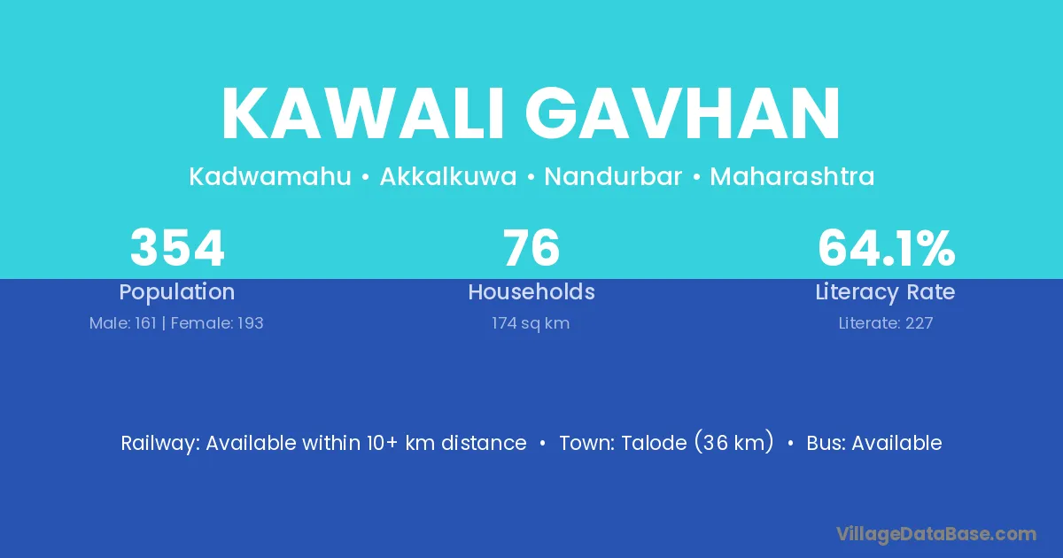 Talode (36 km) is the nearest town to Kawali Gavhan village for major economic activities and is located approximately 36 km away.
