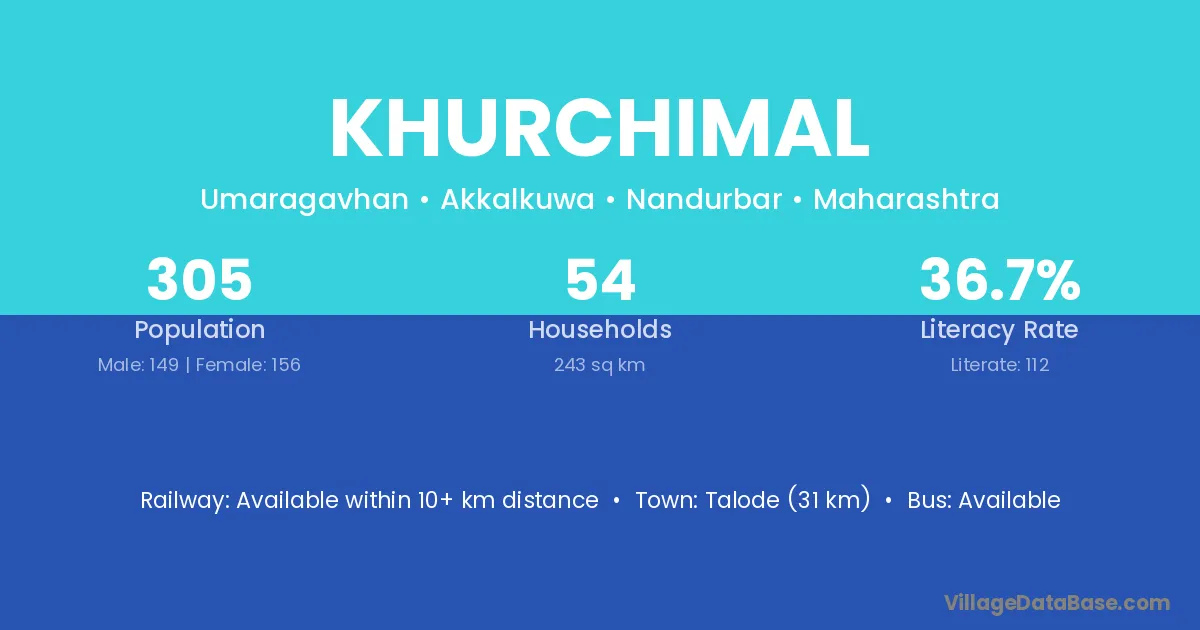 Talode (31 km) is the nearest town to Khurchimal village for major economic activities and is located approximately 31 km away.