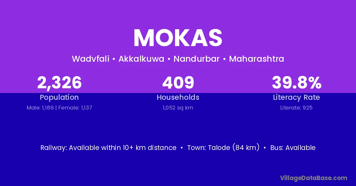 Talode (84 km) is the nearest town to Mokas village for major economic activities and is located approximately 84 km away.