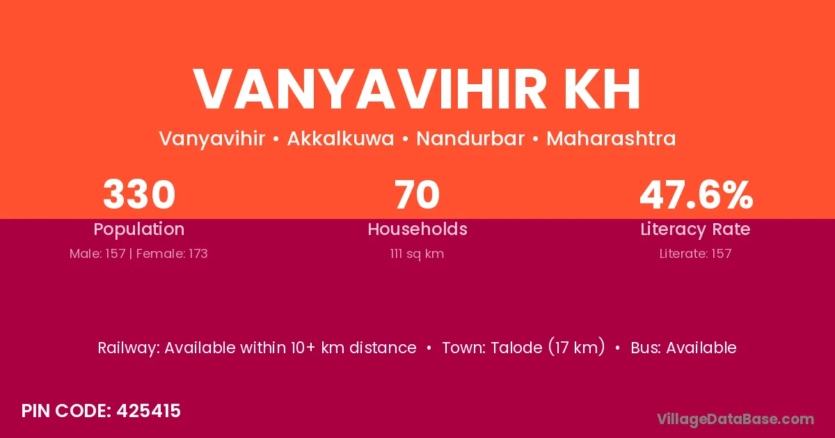Vanyavihir Kh village has a total population of 330 people, of which 157 are males and 173 are females.