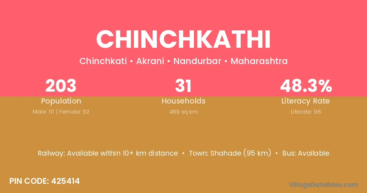 Shahade (95 km) is the nearest town to Chinchkathi village for major economic activities and is located approximately 95 km away.