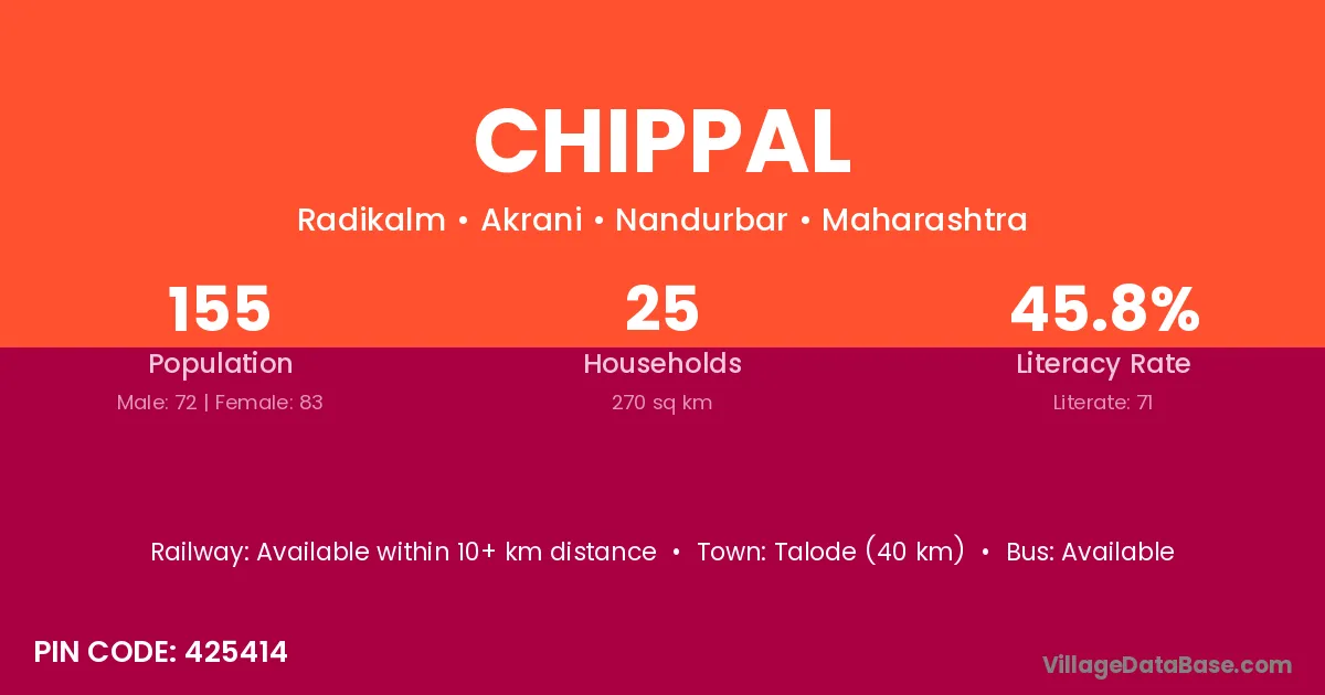 According to Census 2011 information, the village code of Chippal village is 425414.