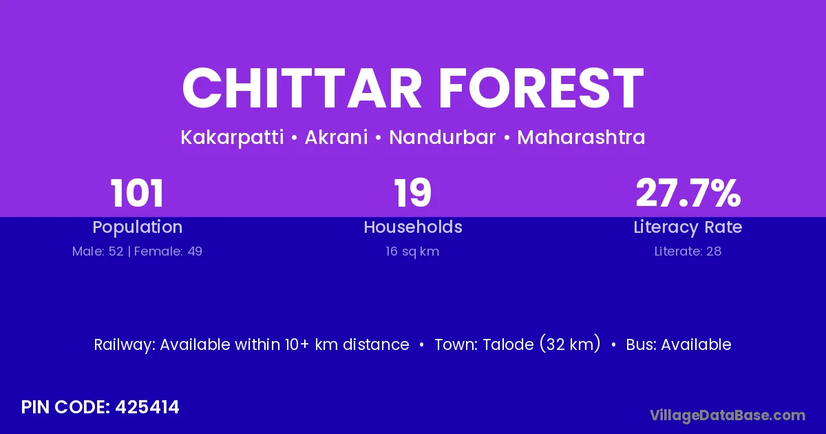 Talode (32 km) is the nearest town to Chittar Forest village for major economic activities and is located approximately 32 km away.