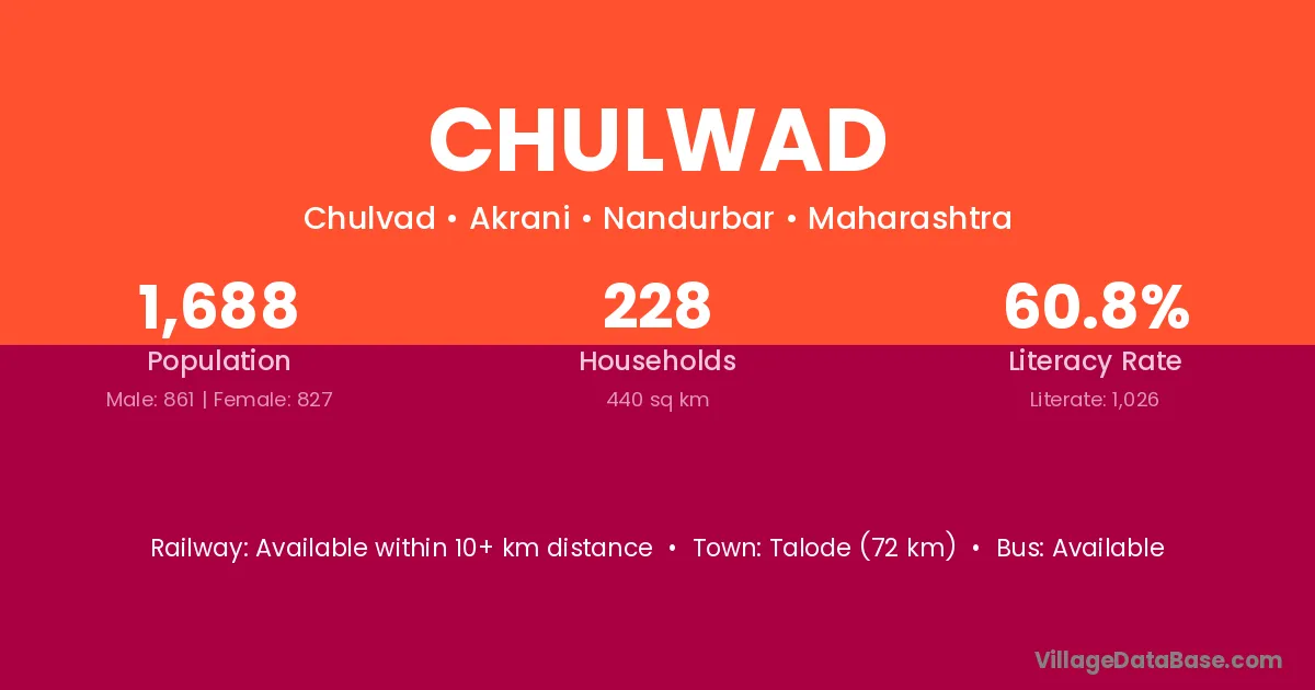 Chulwad village has a total population of 1,688 people, of which 861 are males and 827 are females.
