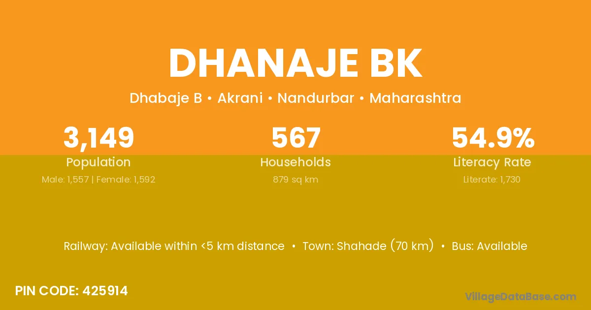 Shahade (70 km) is the nearest town to Dhanaje Bk village for major economic activities and is located approximately 70 km away.