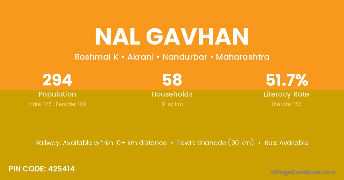 Nal Gavhan village has a total population of 294 people, of which 125 are males and 169 are females.
