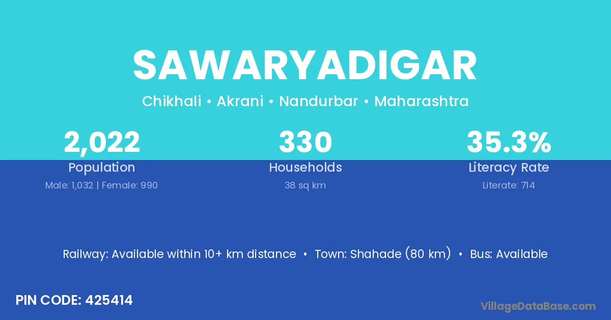 Shahade (80 km) is the nearest town to Sawaryadigar village for major economic activities and is located approximately 80 km away.