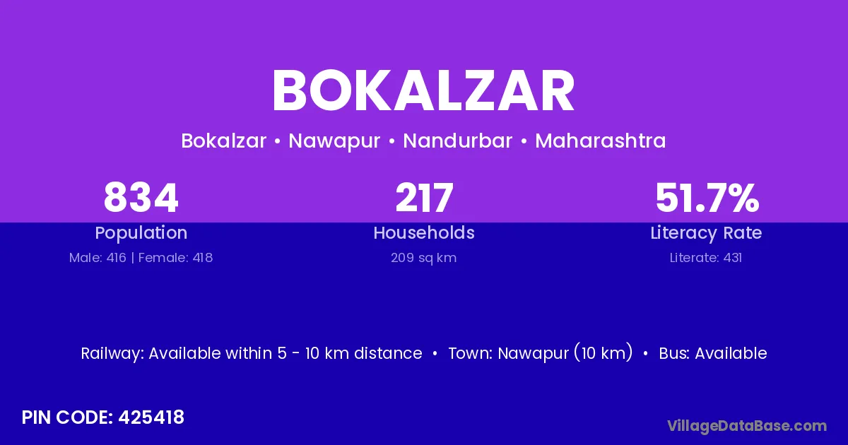 Nawapur (10 km) is the nearest town to Bokalzar village for major economic activities and is located approximately 10 km away.