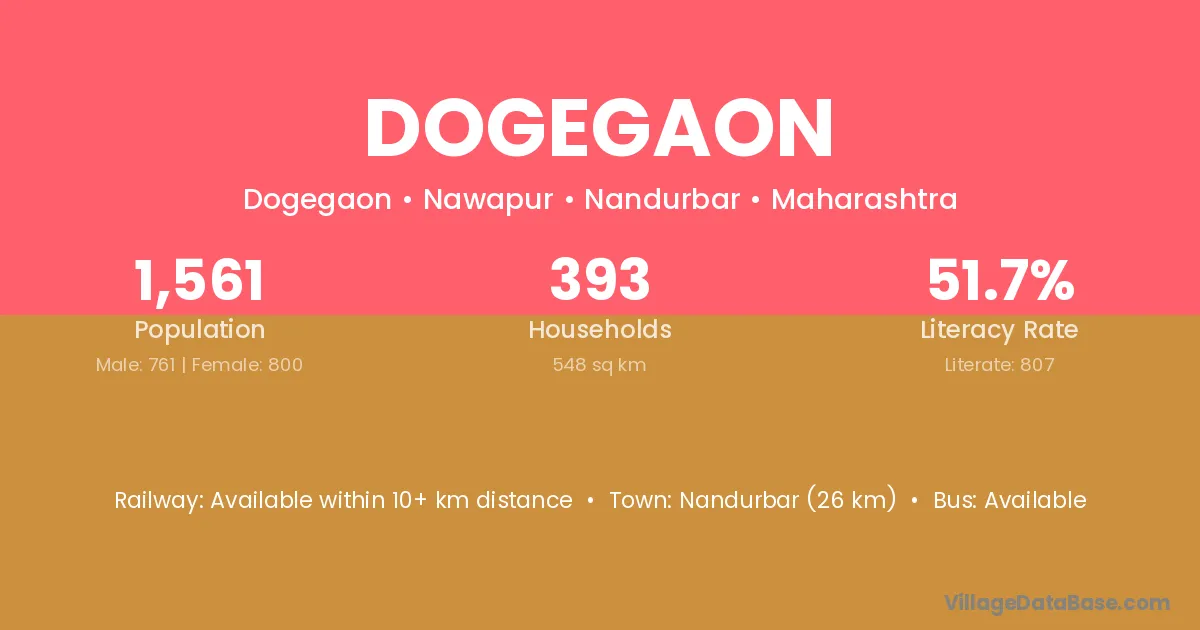Nandurbar (26 km) is the nearest town to Dogegaon village for major economic activities and is located approximately 26 km away.
