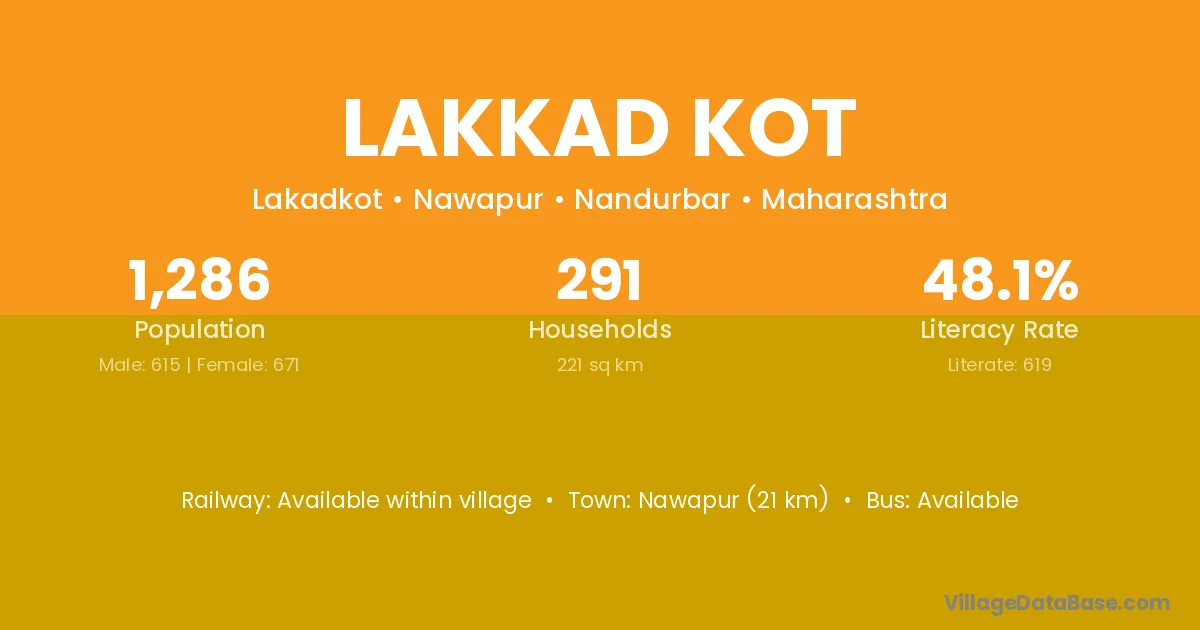 Nawapur (21 km) is the nearest town to Lakkad Kot village for major economic activities and is located approximately 21 km away.