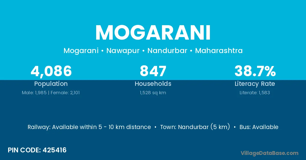 Nandurbar (5 km) is the nearest town to Mogarani village for major economic activities and is located approximately 5 km away.