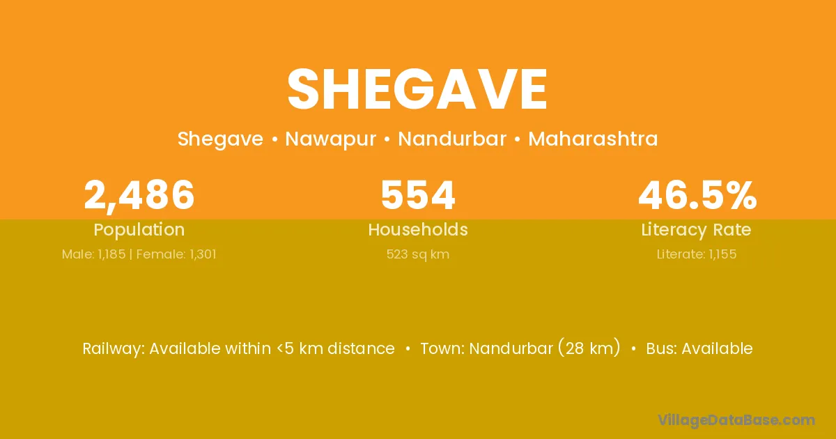 Nandurbar (28 km) is the nearest town to Shegave village for major economic activities and is located approximately 28 km away.