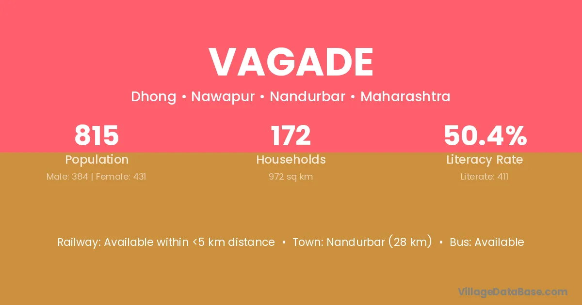 Nandurbar (28 km) is the nearest town to Vagade village for major economic activities and is located approximately 28 km away.