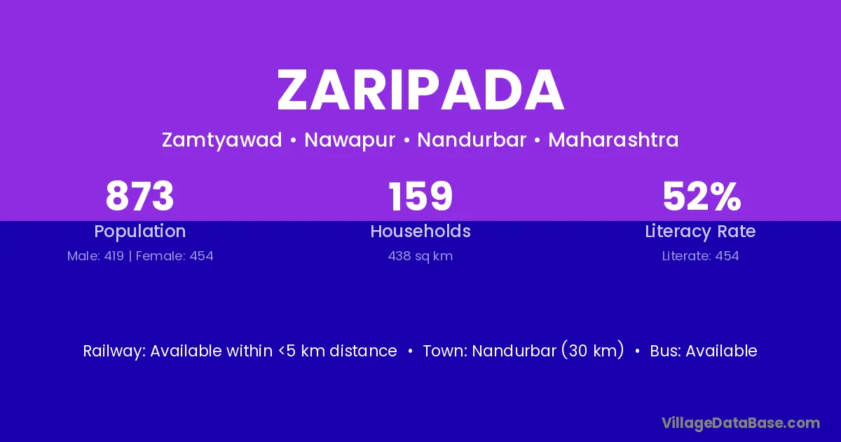 Nandurbar (30 km) is the nearest town to Zaripada village for major economic activities and is located approximately 30 km away.