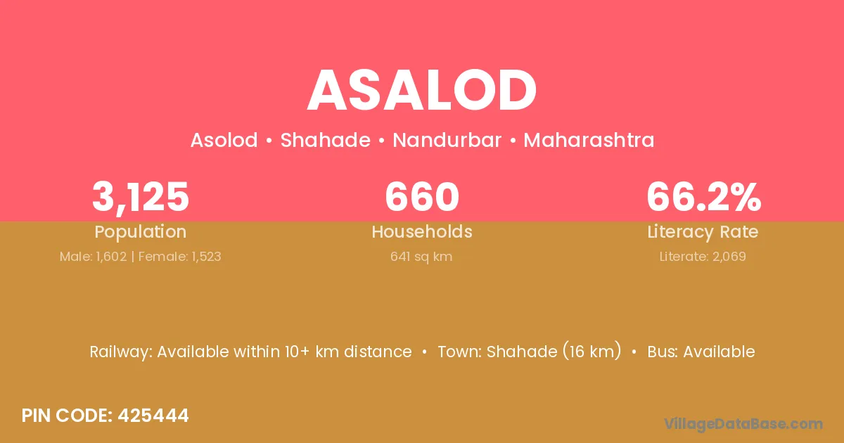 Shahade (16 km) is the nearest town to Asalod village for major economic activities and is located approximately 16 km away.