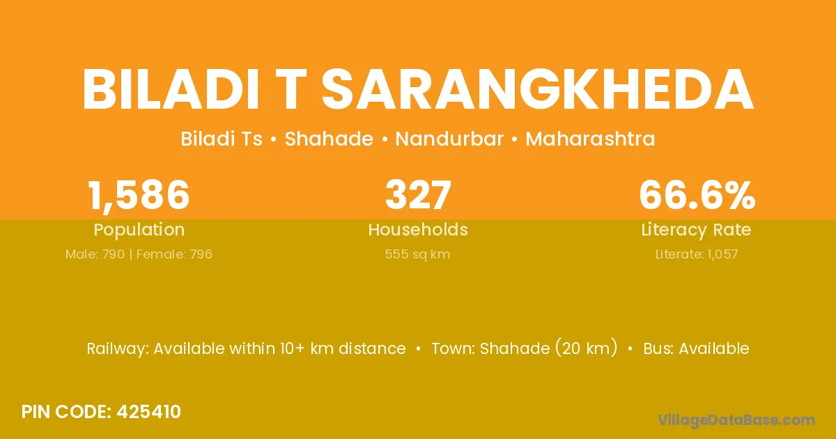 Shahade (20 km) is the nearest town to Biladi T Sarangkheda village for major economic activities and is located approximately 20 km away.