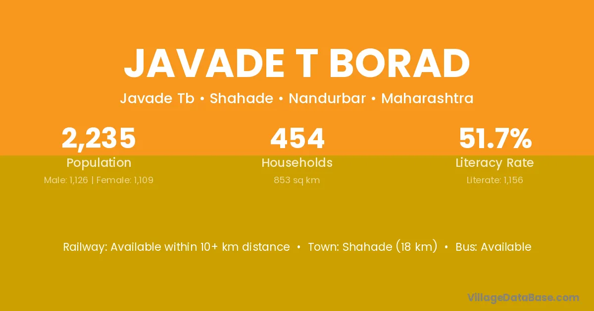 Shahade (18 km) is the nearest town to Javade T Borad village for major economic activities and is located approximately 18 km away.