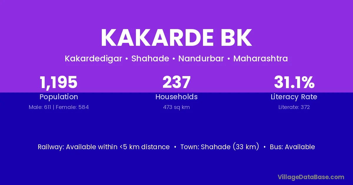 Shahade (33 km) is the nearest town to Kakarde Bk village for major economic activities and is located approximately 33 km away.