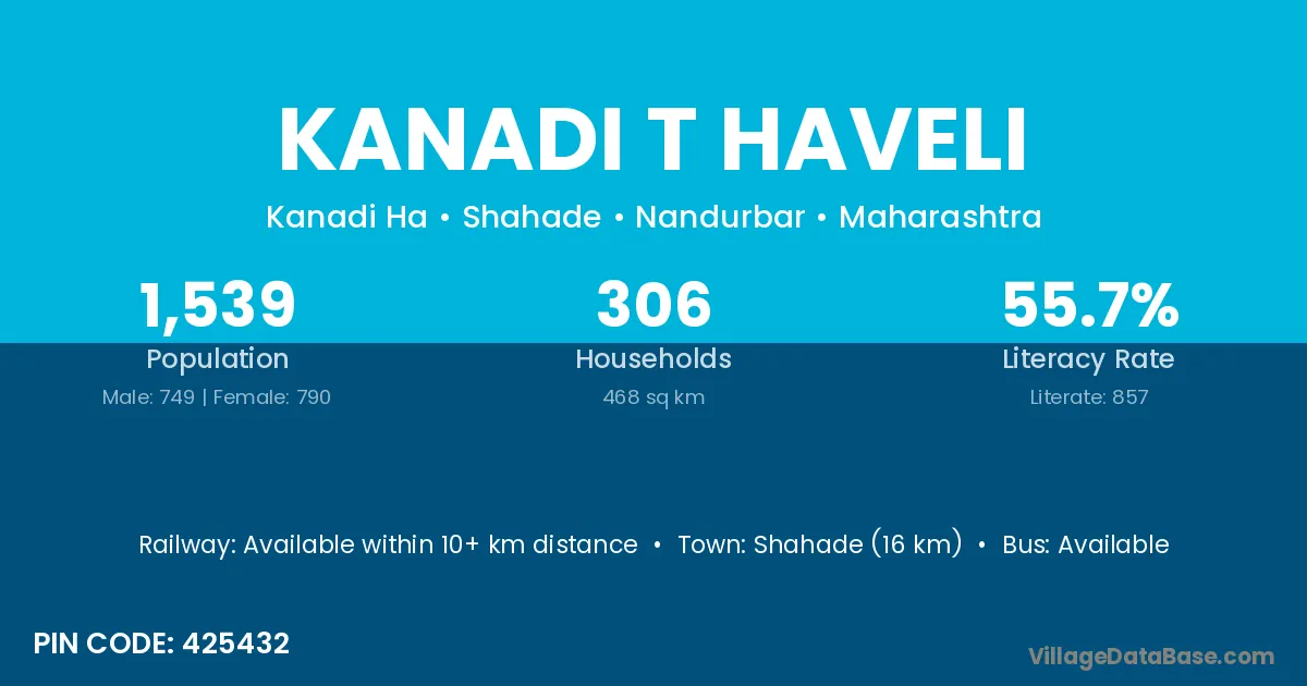 Shahade (16 km) is the nearest town to Kanadi T Haveli village for major economic activities and is located approximately 16 km away.