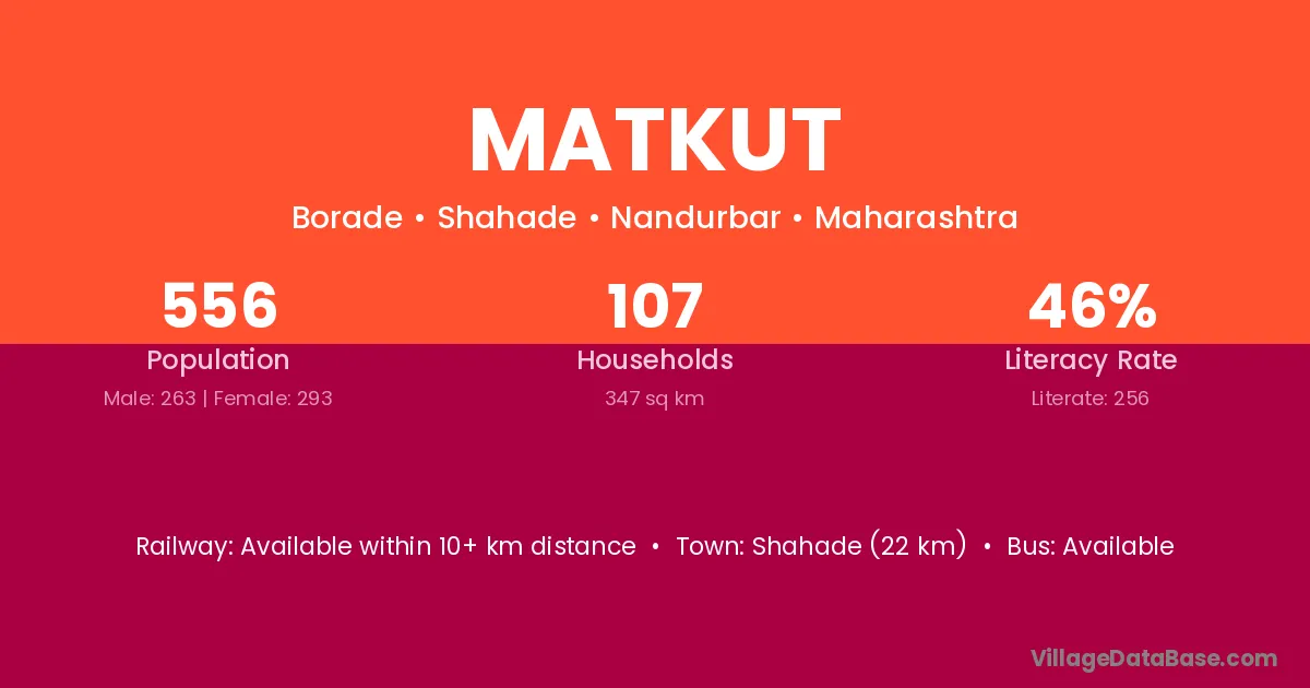 Shahade (22 km) is the nearest town to Matkut village for major economic activities and is located approximately 22 km away.
