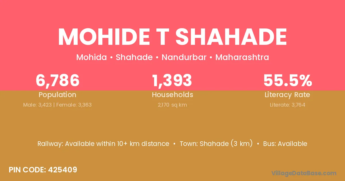 Shahade (3 km) is the nearest town to Mohide T Shahade village for major economic activities and is located approximately 3 km away.