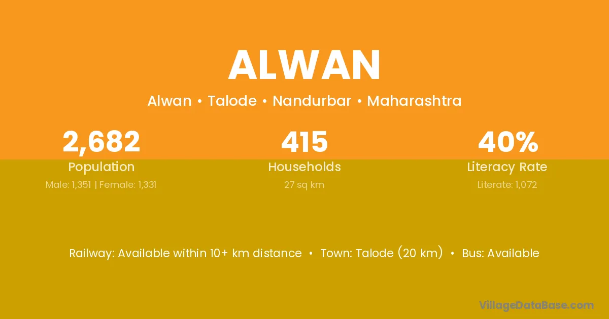 Talode (20 km) is the nearest town to Alwan village for major economic activities and is located approximately 20 km away.