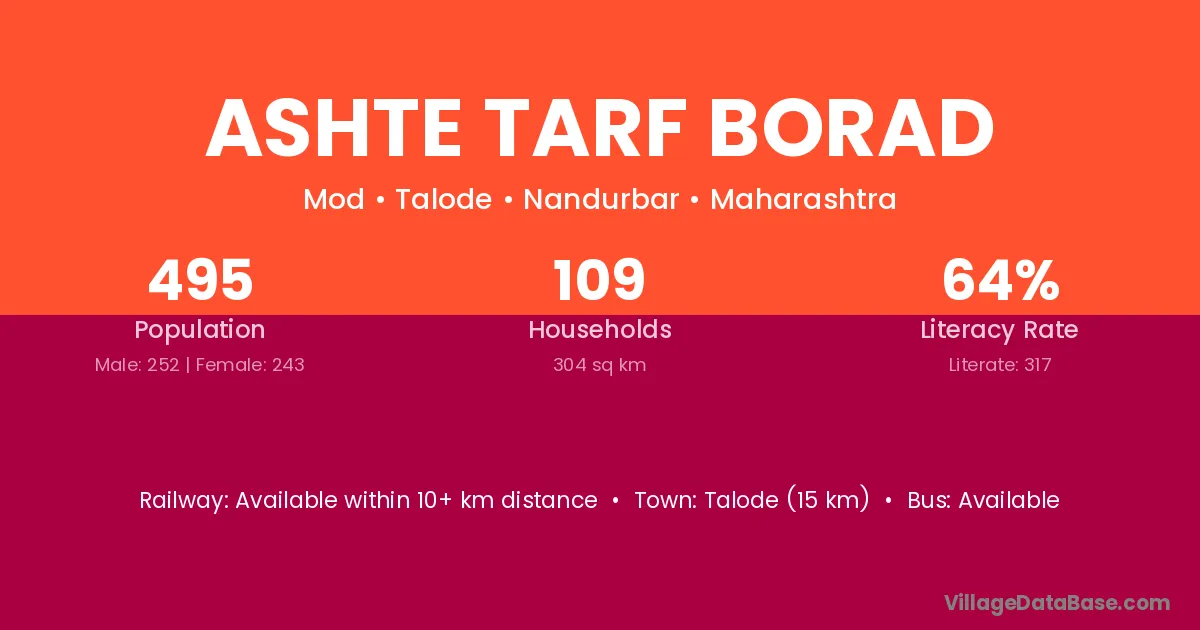 Ashte Tarf Borad village has a total population of 495 people, of which 252 are males and 243 are females.