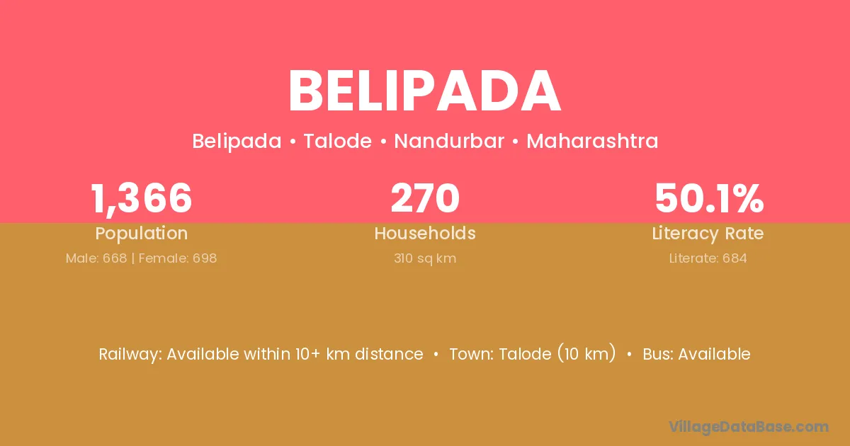 Belipada village has a total population of 1,366 people, of which 668 are males and 698 are females.