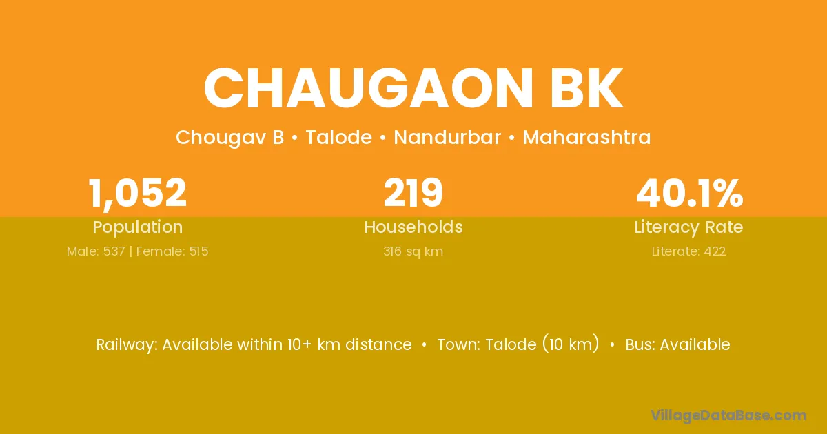 Talode (10 km) is the nearest town to Chaugaon Bk village for major economic activities and is located approximately 10 km away.