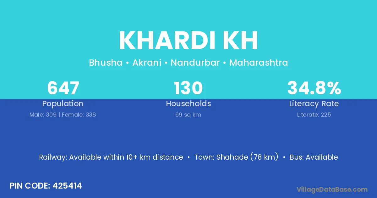 Talode (17 km) is the nearest town to Khardi Kh village for major economic activities and is located approximately 17 km away.
