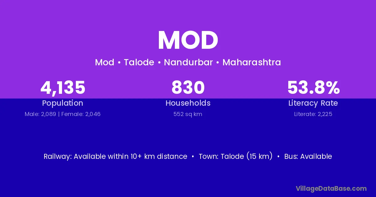 Talode (15 km) is the nearest town to Mod village for major economic activities and is located approximately 15 km away.