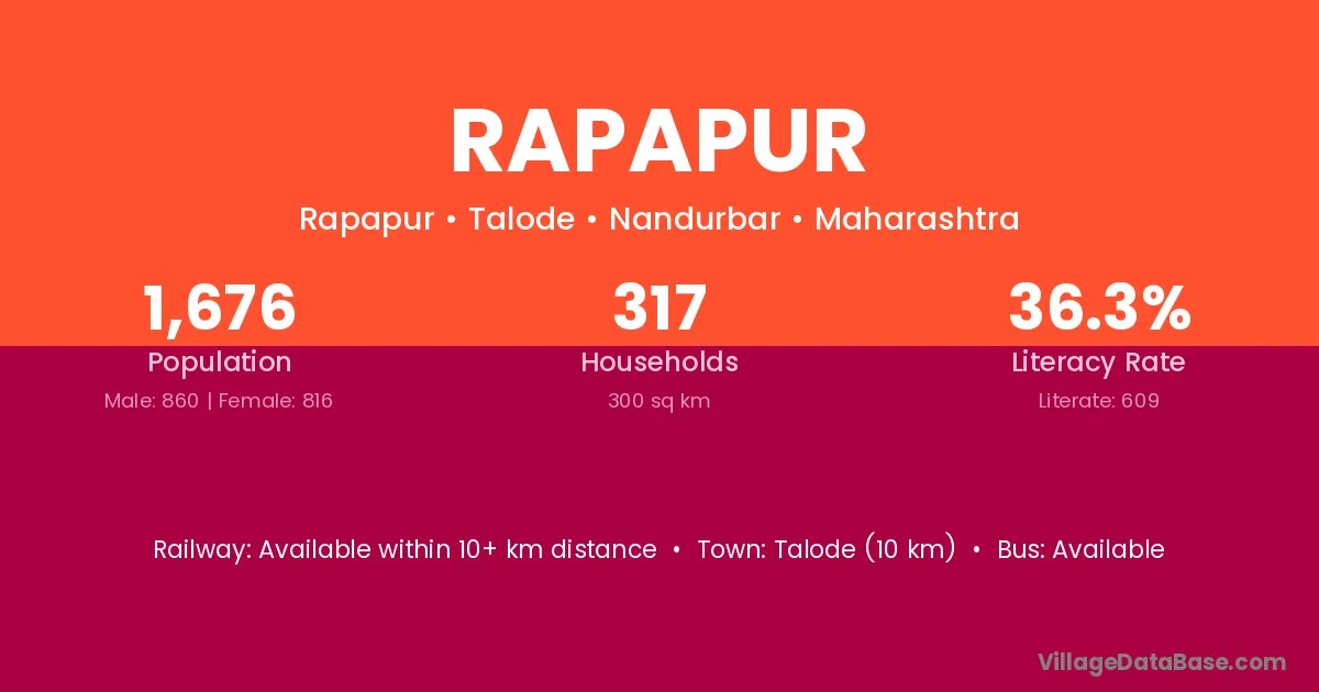Talode (10 km) is the nearest town to Rapapur village for major economic activities and is located approximately 10 km away.