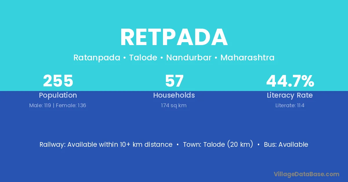Talode (20 km) is the nearest town to Retpada village for major economic activities and is located approximately 20 km away.