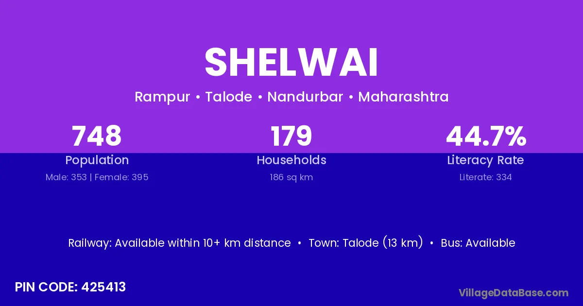 Talode (13 km) is the nearest town to Shelwai village for major economic activities and is located approximately 13 km away.