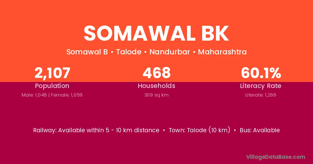 Somawal Bk village has a total population of 2,107 people, of which 1,048 are males and 1,059 are females.