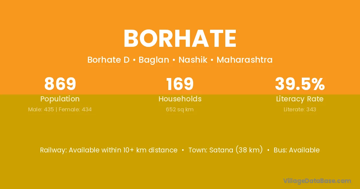 Satana (38 km) is the nearest town to Borhate village for major economic activities and is located approximately 38 km away.