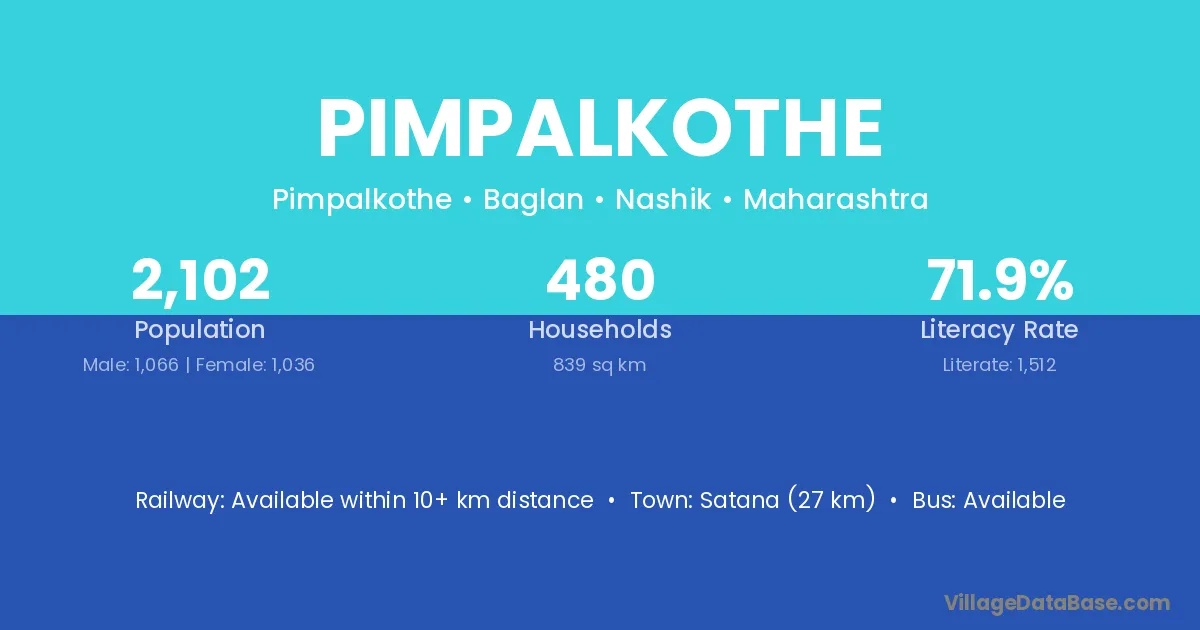 Satana (27 km) is the nearest town to Pimpalkothe village for major economic activities and is located approximately 27 km away.