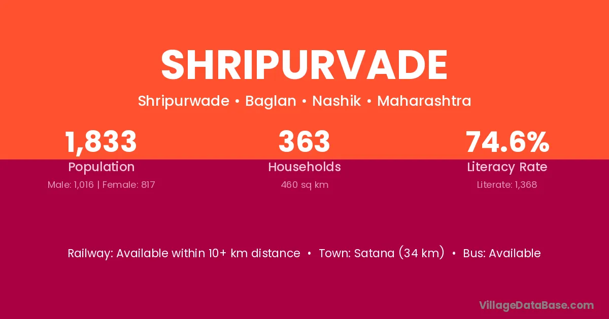 Satana (34 km) is the nearest town to Shripurvade village for major economic activities and is located approximately 34 km away.