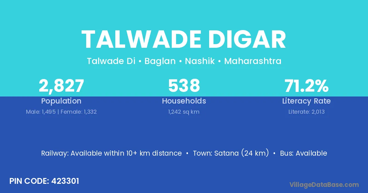 Satana (24 km) is the nearest town to Talwade Digar village for major economic activities and is located approximately 24 km away.