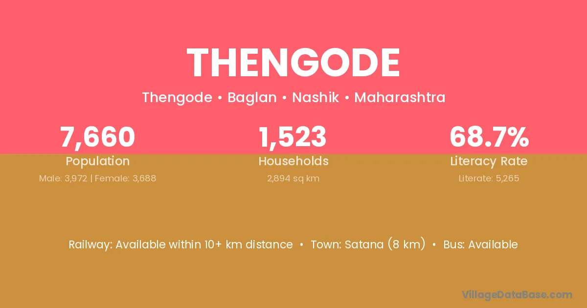 Satana (8 km) is the nearest town to Thengode village for major economic activities and is located approximately 8 km away.