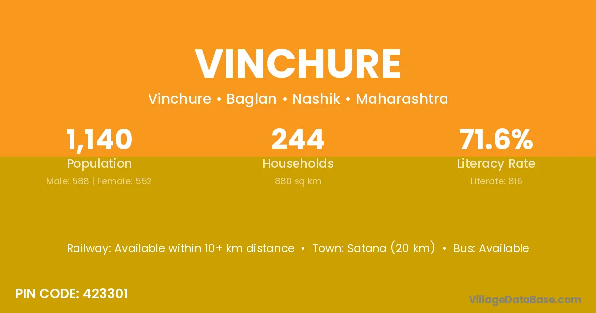 Satana (20 km) is the nearest town to Vinchure village for major economic activities and is located approximately 20 km away.