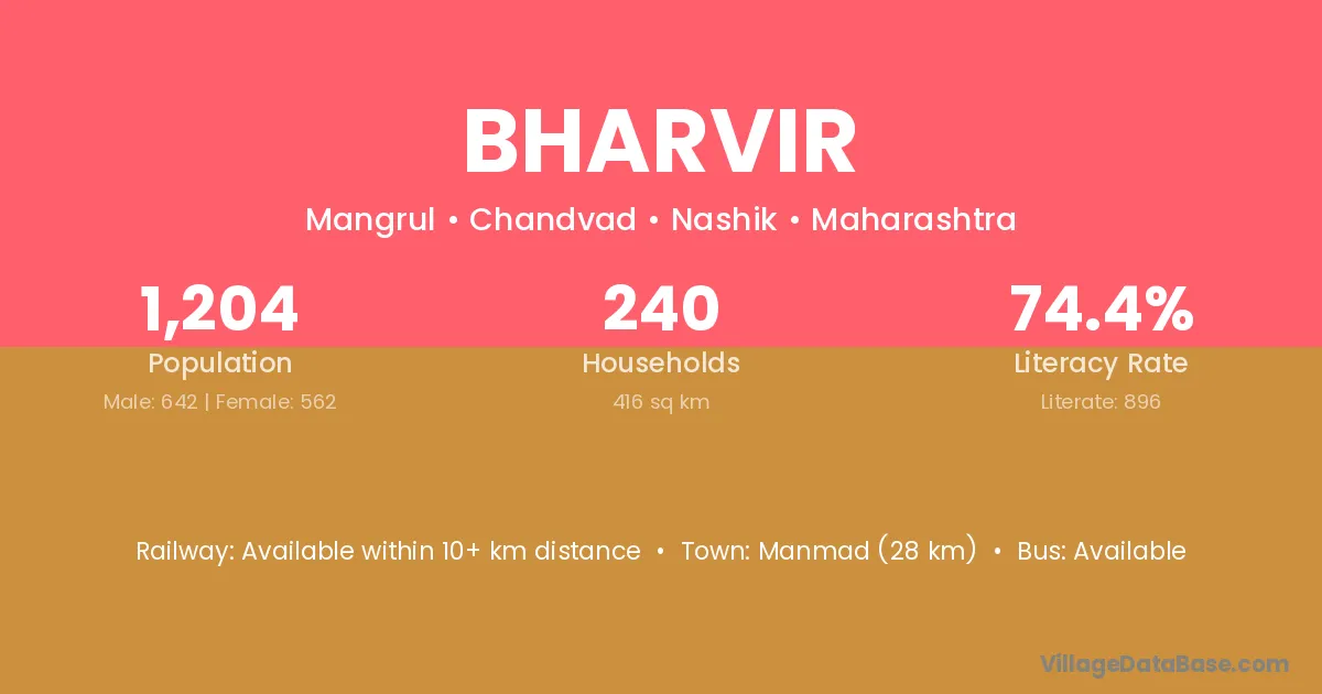 Manmad (28 km) is the nearest town to Bharvir village for major economic activities and is located approximately 28 km away.