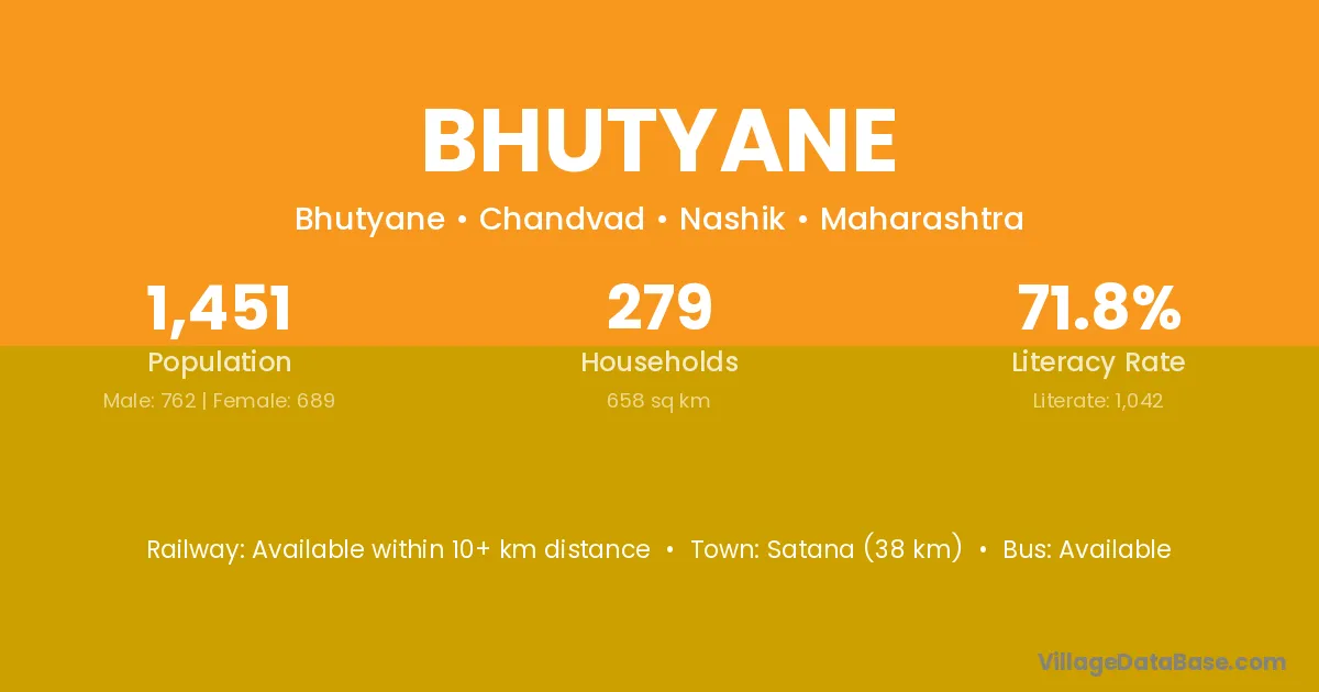 Satana (38 km) is the nearest town to Bhutyane village for major economic activities and is located approximately 38 km away.