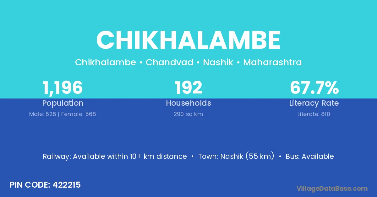 Nashik (55 km) is the nearest town to Chikhalambe village for major economic activities and is located approximately 55 km away.